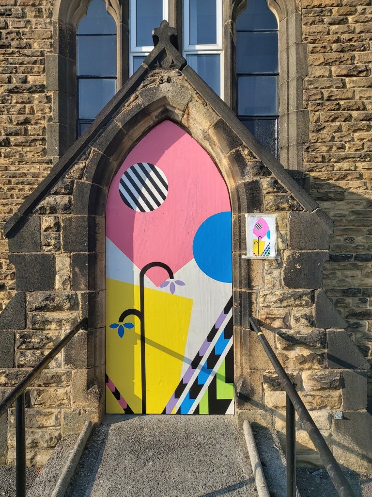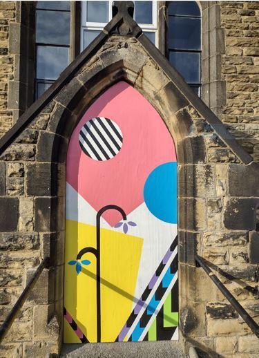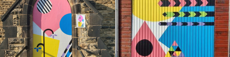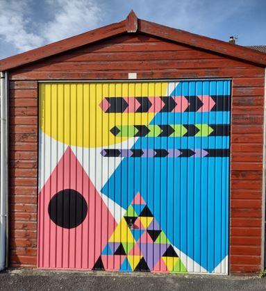 We were commissioned by Craven Arts House in 2021 to create two bright, colourful murals to reflect the vision Craven Arts had for the building and highlight the creativity and innovation that would be housed inside. The mural on the front door is now housed inside the building while the mural on the garage is still accessible around the side of the building on the car park.